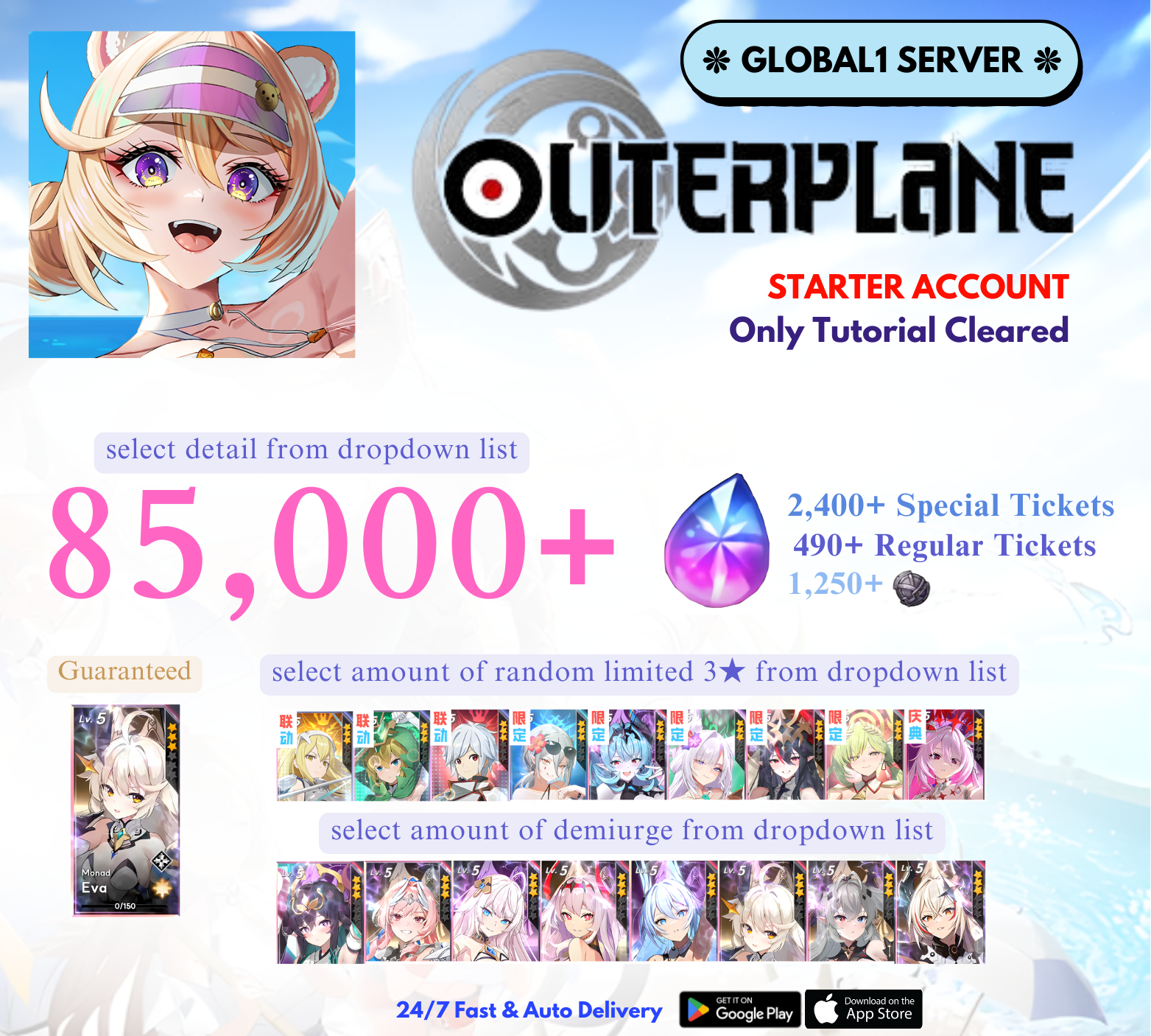 - This listing is for a OUTERPLANE reroll account on the Global1 server with: